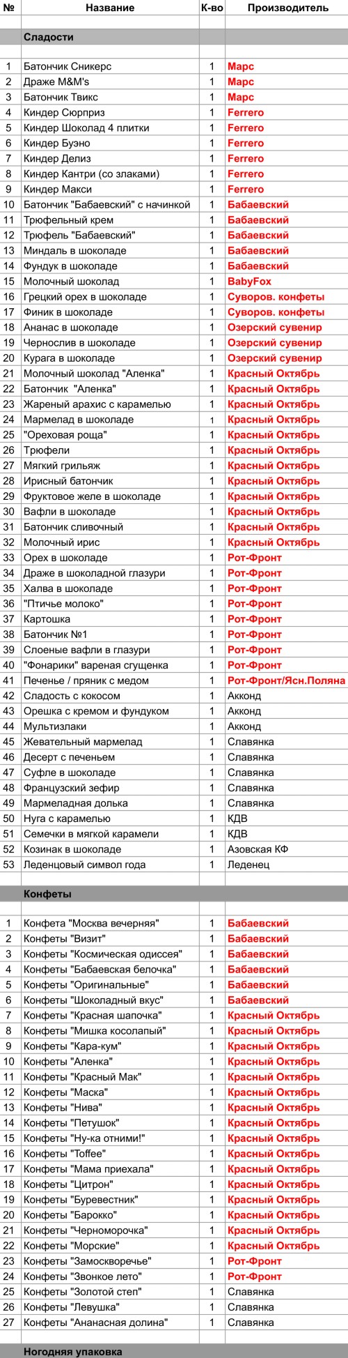 Молочный шоколад "Аленка" (1 шт), Батончик "Аленка" (1 шт), Жареный арахис с карамелью (1 шт), Мармелад в шоколаде (1 шт), "Ореховая роща" (1 шт), Трюфели (1 шт), Мягкий грильяж (1 шт), Ирисный батончик (1 шт), Фруктовое желе в шоколаде (1 шт), Вафли в шоколаде (1 шт), Батончик сливочный (1 шт), Молочный ирис (1 шт), Конфеты "Красная шапочка" (1 шт), Конфеты "Мишка косолапый" (1 шт), Конфеты "Кара-кум" (1 шт), Конфеты "Аленка" (1 шт), Конфеты "Красный Мак" (1 шт), Конфеты "Маска" (1 шт), Конфеты "Нива" (1 шт), Конфеты "Петушок" (1 шт), Конфеты "Ну-ка отними!" (1 шт), Конфеты "Toffee" (1 шт), Конфеты "Мама приехала" (1 шт), Конфеты "Цитрон" (1 шт), Конфеты "Буревестник" (1 шт), Конфеты "Барокко" (1 шт), Конфеты "Черноморочка" (1 шт), Конфеты "Морские" (1 шт)